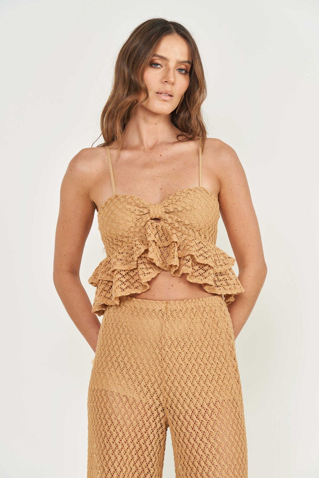 Design: Apresenta uma modelagem justa e cropped, valorizando a silhueta com modernidade. O decote sutil de coração/reto é complementado por alças finas e reguláveis, que conferem delicadeza. A barra é adornada com babados em camadas que adicionam volume, movimento e um charme romântico, evocando a fluidez das paisagens italianas.