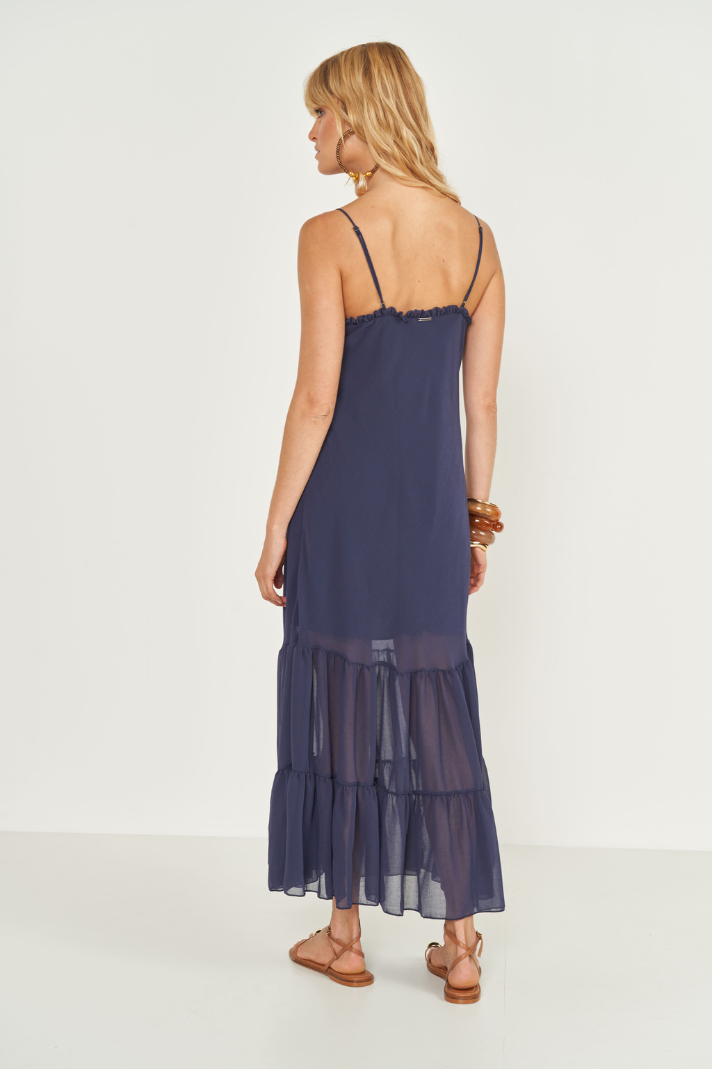 Peça: Vestido Longo Comfort Com Babados. Cor: Azul Marinho (clássico e sofisticado, remetendo ao mar). Tecido: Corpo: 100% Poliéster, proporcionando leveza, fluidez e secagem rápida. Forro: 100% Viscose, garantindo conforto extra e um toque suave na pele. Design: Modelagem longa e fluida, com alças finas e decote em V com delicado franzido no busto, que valoriza o colo. A saia é ampla e possui babados em camadas na parte inferior, criando um efeito transparente e de movimento. Detalhes: Os babados em camadas na barra são o grande destaque, conferindo um charme romântico e moderno. O tecido leve garante um caimento esvoaçante. Pequena placa metálica com o logo COLCCI na parte traseira do busto. Funcionalidade: Leve, fresco e com caimento impecável, é ideal para o calor, proporcionando conforto e um visual estiloso e sofisticado para diversas ocasiões do verão.
